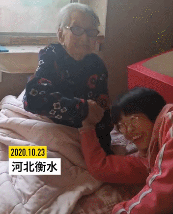 俩孙媳妇经常来探望,来了有时还和老太太扳手腕逗乐,哄老太太开心。