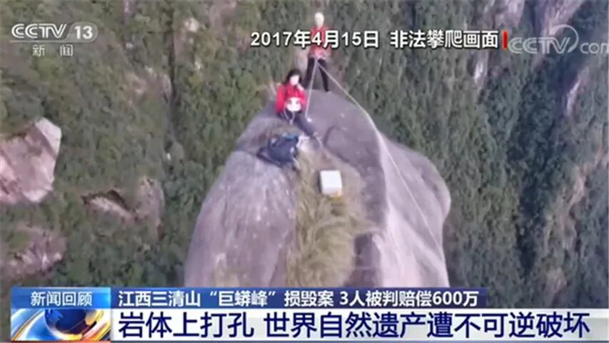 2017年4月,三名“驴友”为攀爬巨蟒峰,在山体上打入26根岩钉,最终因故意损毁名胜古迹被判刑,而且被判赔偿600万元,该案例还被写入了2020年最高法的工作报告中。