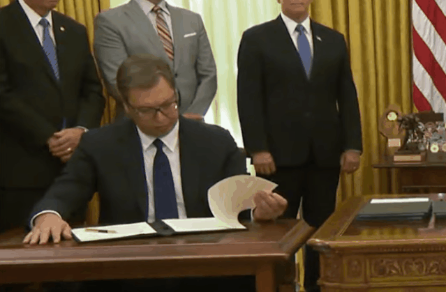 9月4日,塞尔维亚总统武契奇与科索沃领导人萨奇都在白宫,双方签署了经济正常化协议,科索沃取消了2018年强加100%关税,而美国则准备撤出一部分军队并提供数亿美元的援助作为补偿。