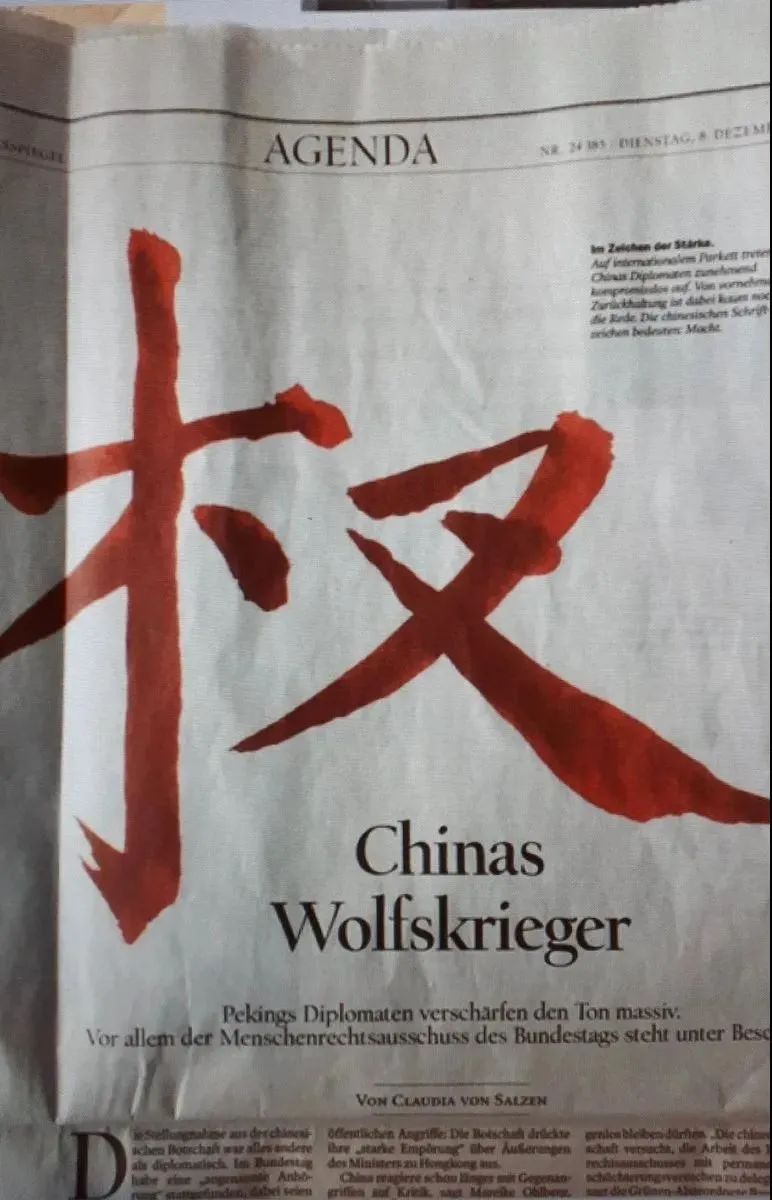 据环球时报转引德国《每日镜报》12月8日以“中国的战狼”为题刊登一篇批评性报道,指责中国“战狼外交”。写这篇报道的是一名曾驻俄罗斯和东欧的记者,从简历看没有中国经历,报道称德国联邦议院人权委员会11月18日举行所谓“中国人权听证会”,招致中国大使馆批评。