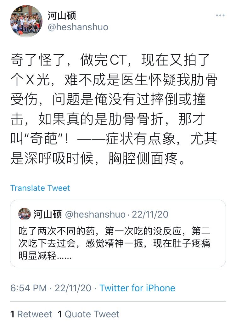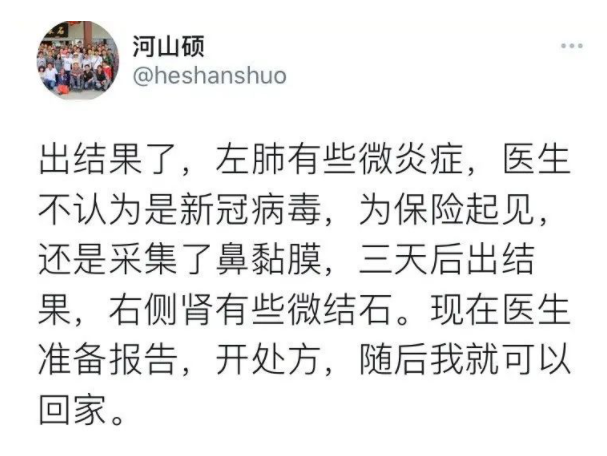 然后他又发帖称:出结果了,左肺有些微炎症,医生不认为是新冠,为保险起见采集了鼻粘膜,三天后出结果······现在医生准备报告,开处方,随后我就可以回家。
