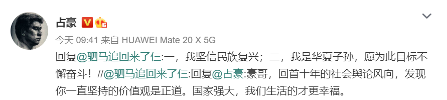 恰好,今天上午就有战友在占豪的微博里说了他的感受,他说:豪哥,回首十年的社会舆论风向,发现你一直坚持的价值观是正道。国家强大,我们生活得才会更幸福。