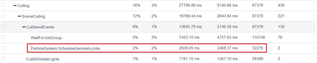 同时,粒子系统在渲染时也需要在CPU端进行准备,比如粒子系统的Culling和Draw Call操作等等,这些也都属于CPU端开销,如下图所示。
