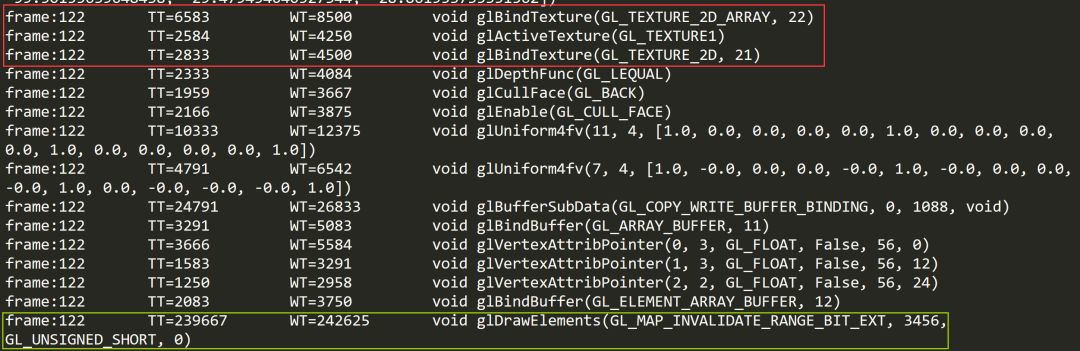 UWA做了个简单实验验证了一下,下图分别是用Texture2D和Texture2DArray渲染地形结果和GLES API调用。实验设备为三星S6。