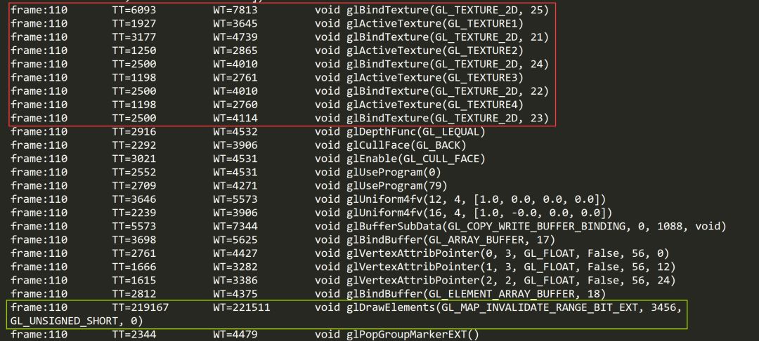 其中,GLES API调用图中红色框表示纹理绑定的API调用,绿色框表示渲染API调用。WT表示了该API调用的耗时,单位为纳秒。从Texture2D图中可知一共有5次纹理绑定,分别对应于材质中的5张纹理绑定,而Texture2DArray图中只有两次调用,分别是splat纹理和四层混合纹理的绑定。从图中可知一次glBindTexture的耗时大约为1000~10000ns,即最多0.01ms。因此,三次glBindTexture加上三次glActiveTexture也最多0.06ms。所以看不出来。