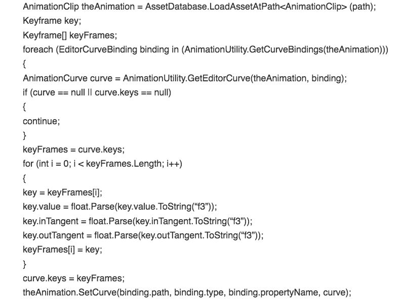 A:丢失的信息是mEditorcurves, 该字段只对anim在Editor中的内存占用产生影响,对其在真机运行时的动画效果与内存占用并无影响。因此该字段列表为空与否不会影响其在真机中的表现,可以用提问中的方式对其进行精度处理。如果想保留该字段(虽然对真机内存无影响),可以通过文本处理的方法对anim文件进行精度处理,处理时跳过mEdtorcurves字段。