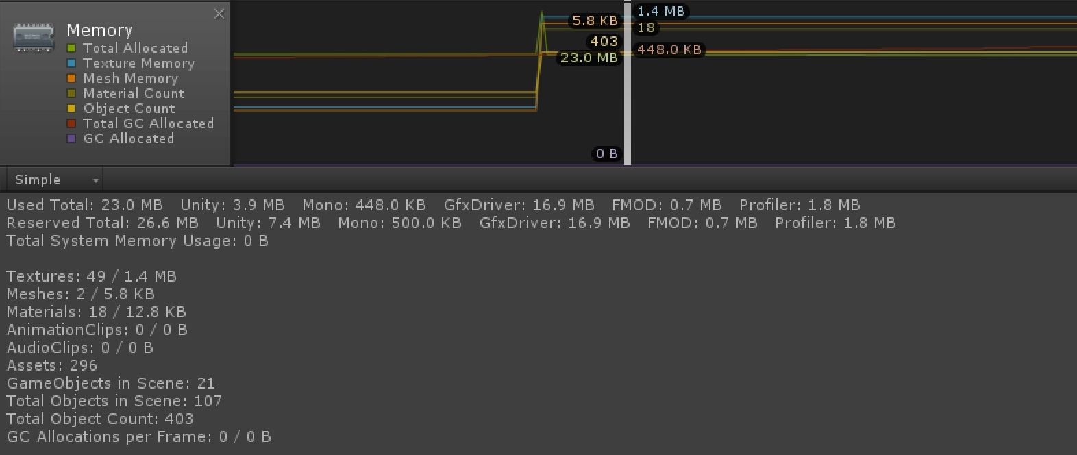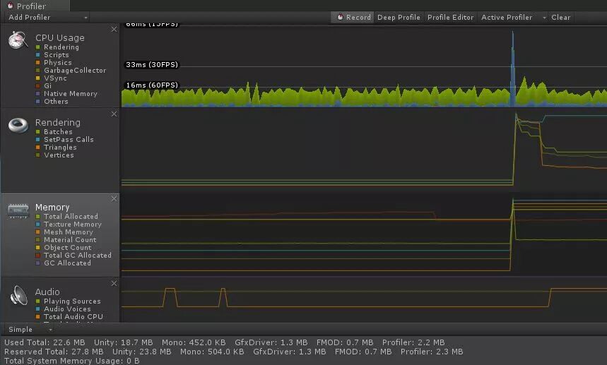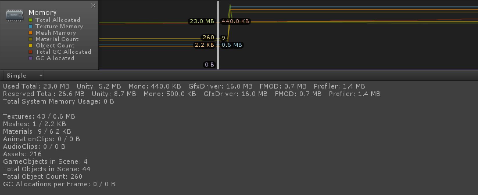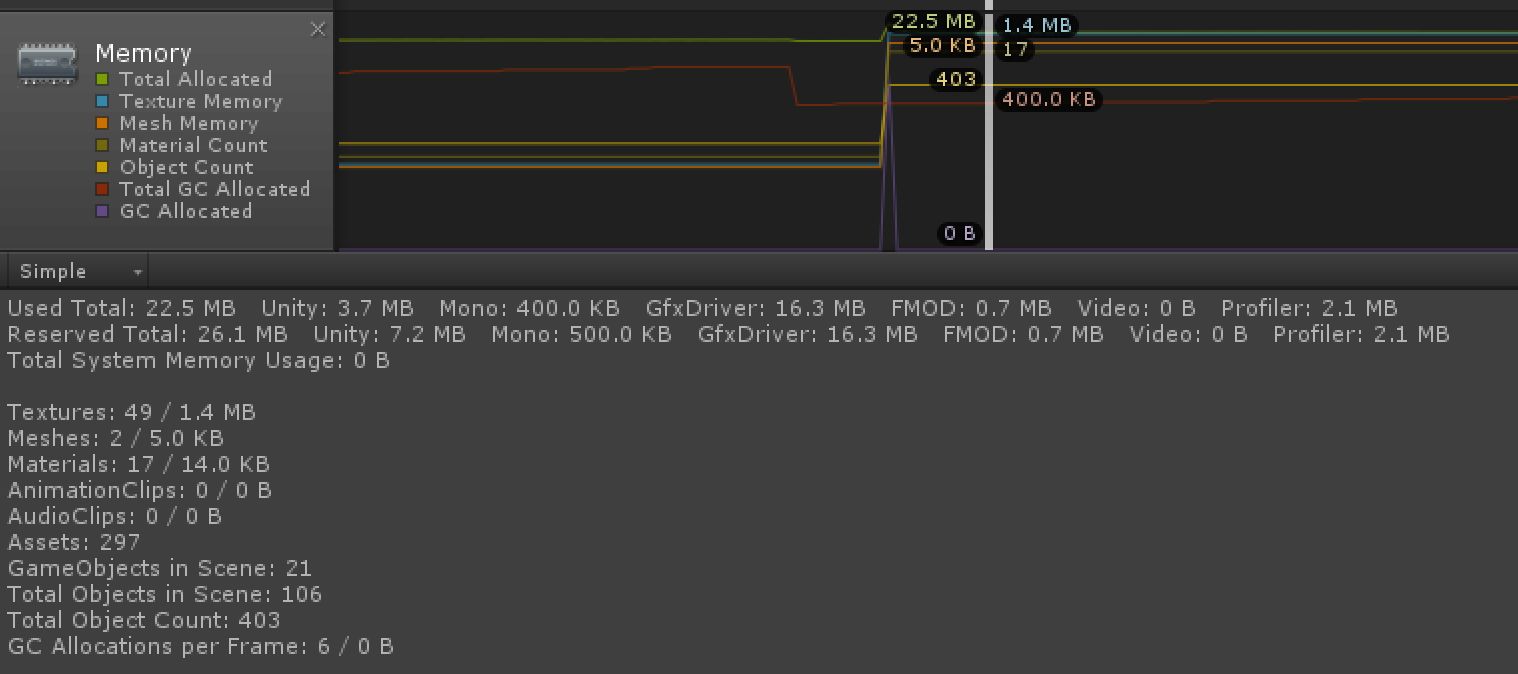 Q:我们用的是Unity 5.5.2,下图是红米2上测试的加载8个特效资源,峰值是46MB,然后就下落到22.6MB,这个内存波动是什么引起的,是因为Rendering Batches吗?