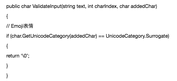 A:我们现在的处理方案,在inputfield上挂一个组件,采用类似代码来过滤表情符号,不过还没测试过能够完全符号所有表情符号,虽然不能过滤到所有的表情符号,但也不会报错。