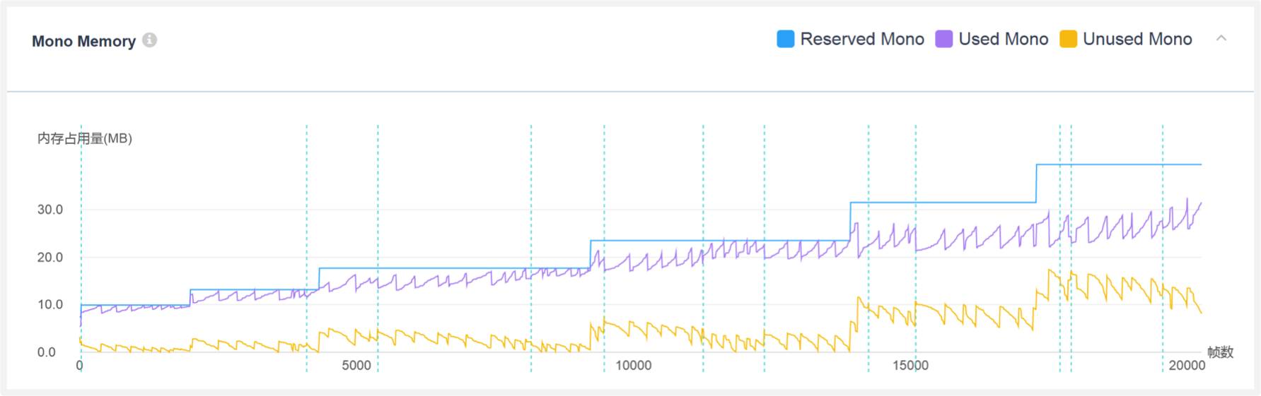 下图是UWA性能测评报告中的Mono堆内存走势图,其中的紫色线条即为项目运行时的ManagedHeap.UseSize,而黄色线条为ReservedUnuseSize,这两者都是在变化的,但最需要关心的是蓝色线条Reserved Mono,这条线条如果持续往上走,那么就说明项目中是很可能出现了内存泄露问题,需要研发团队彻查,建议通过Mono详细堆内存分析来进行修复。