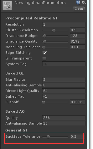 A:我找到了另一种方式,修改LightmapParameters的,新建一个LightmapParameters,修改里面的Backface,Tolerance改为很小的值就行,我的是0.2,如图: