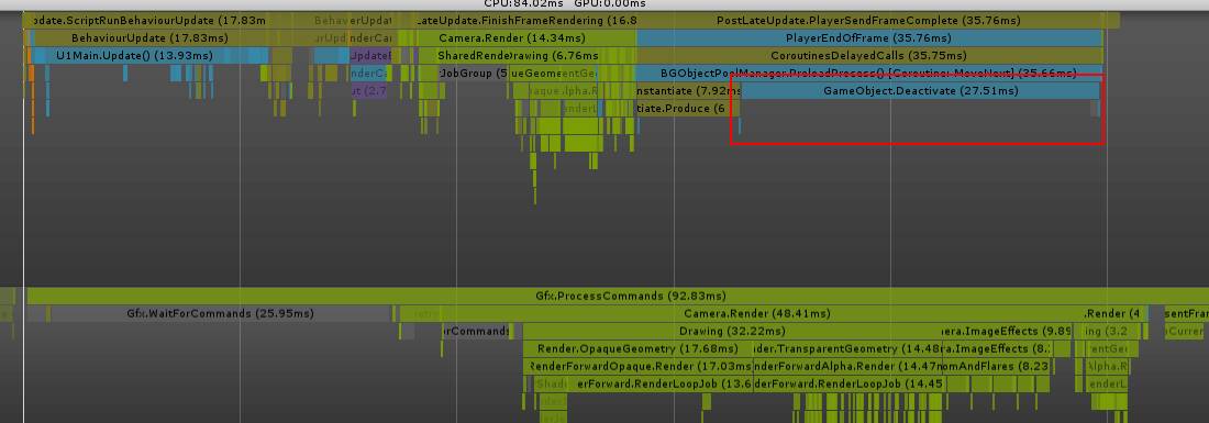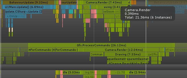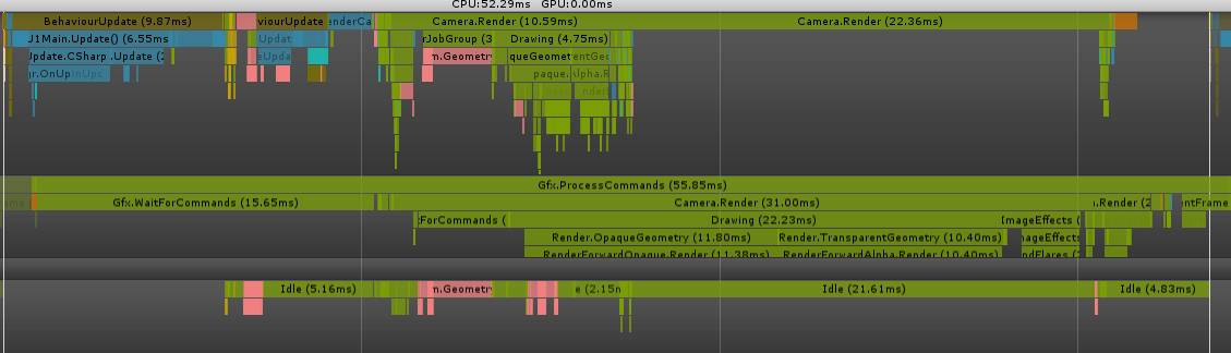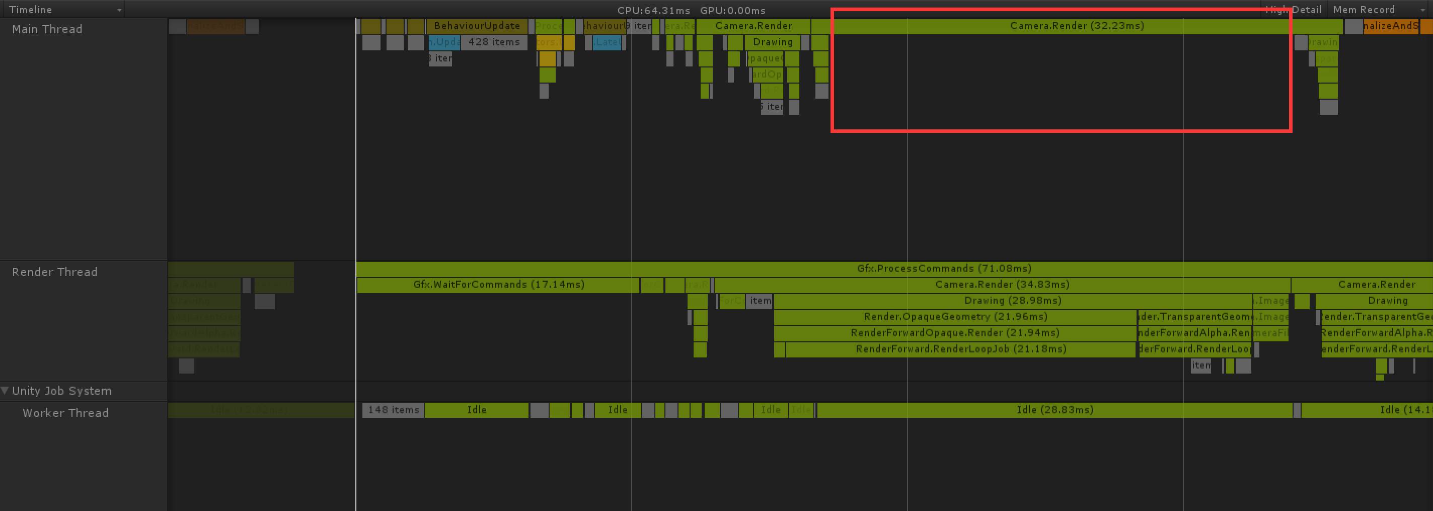 而下图是关闭了大部分UI,UI相机依然工作,但并没有出现这个异常的等待,我们观察到上图中第二个Camera.Render的首个任务是WaitForJogGroup,并且Job Thread在相同时刻出现了Particle Job,我们怀疑只要这个相机出现了particle system就会出现这种情况,但暂未确定,不知道各位是否有遇到这种情况,以及Unity是不是存在这个问题,如果是5.6的问题,那么后续的版本是否有解决呢?