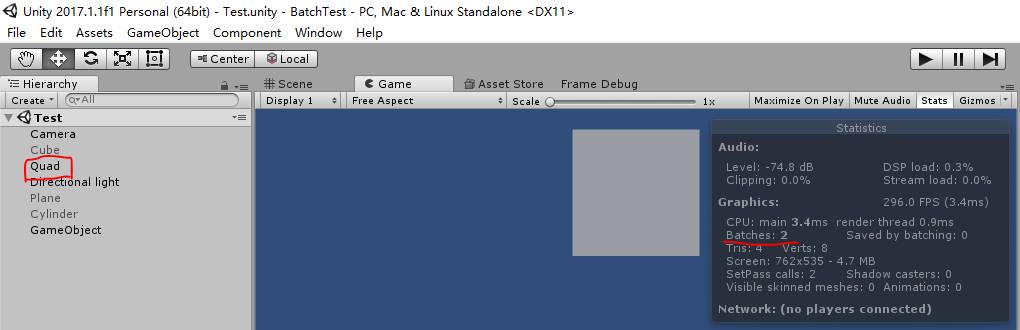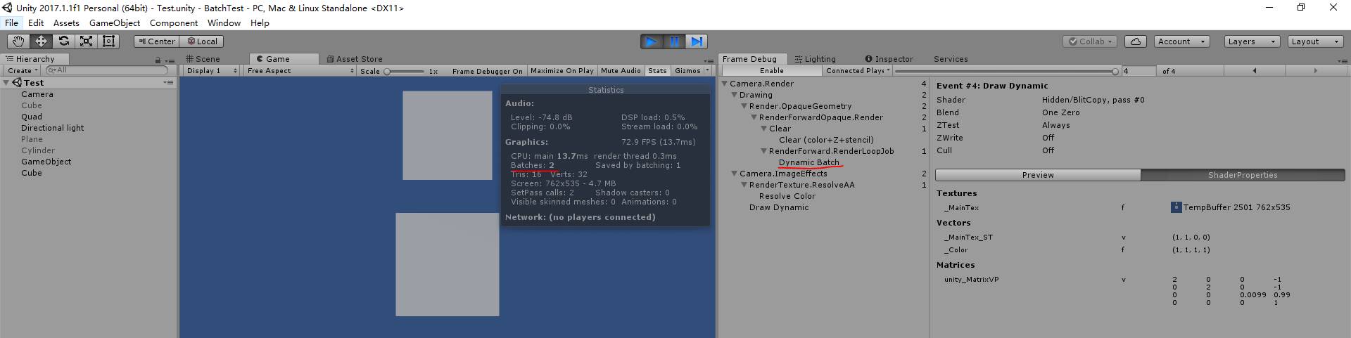 如上图所示,一个场景里包含2个Cube和一个Quad,除了位置不一样外,其他完全一致:相同的缩放、相同的材质,且均未使用Lightmap,但是只有2个Cube动态合批了,Quad则未合批成功(测试过如果场景中有Plane,Quad和Plane会被合批)。Frame Debugger也没有合批失败的相关提示,我的疑点是:
