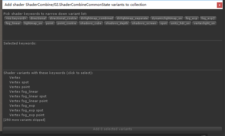至于一个Shader到底会生成多少Variant呢?精确的计算方法,Unity并没有给出,但是我的归纳总结一下就是几组不同的编译宏的组合了,比如雾效、光照图、光源、阴影等等。另外还可以通过Unity的工具Shader Variant Collection来查看一个Shader到底有多少个Variant,也可以在里面来自己组合和预编译自己想要的Variant。