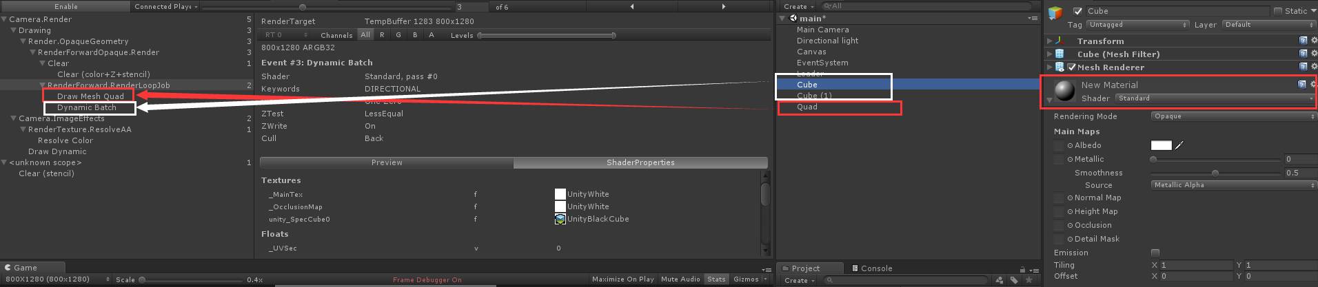 同时,从Frame Debugger的结果也可以看到,此时Cube和Quad已经合并了。因此,我们认为Standard Shader对有UV2和没有UV2的Mesh进行了分别渲染,从而导致无法进行合批。