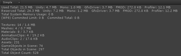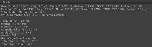 A:我们做了一个简单的例子,在工程里放一个英文字体,且勾选了 Include font data,在 UILabel 中使用。第一种情况是只输入英文,第二种情况是再输入两个中文。连 Profiler 之后的数据分别是下面两张图: image1.png、image2.png,可见 Unity 部分的内存确实是增加了的。但在 Detailed 模式下,两种情况的内存是完全一样的。 说明 Detailed 模式下 Unity 没有统计 Fallback 中系统字体大小,而 Simple 下的 Unity 部分则是统计到了的。所以只能建议题主自行测试一下,通过对比 Simple 模式下的 Unity 部分,来估计下在使用生僻字后,由于系统文字的加载而增加的内存量。