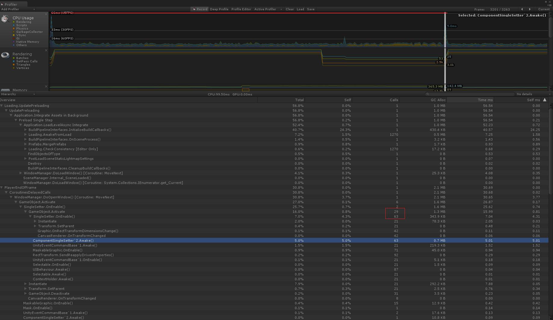 上图中其他蓝框中可以看出,其他较高的CPU耗时和堆内存分配其实是各脚本的Awake代码造成的,而这些脚本是题主团队缩写的自身代码,绝大部分开销并不出自于Unity引擎API。因此,需要题主对自身代码进行进一步检测,查看其CPU耗时和堆内存分配是否合理。