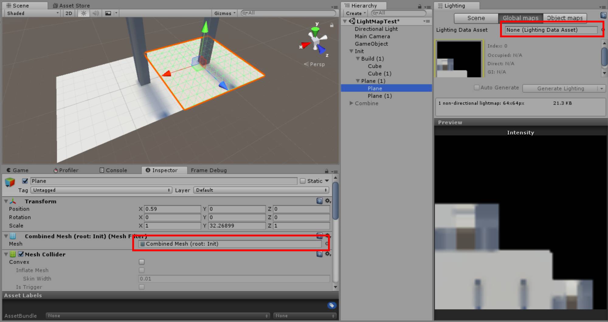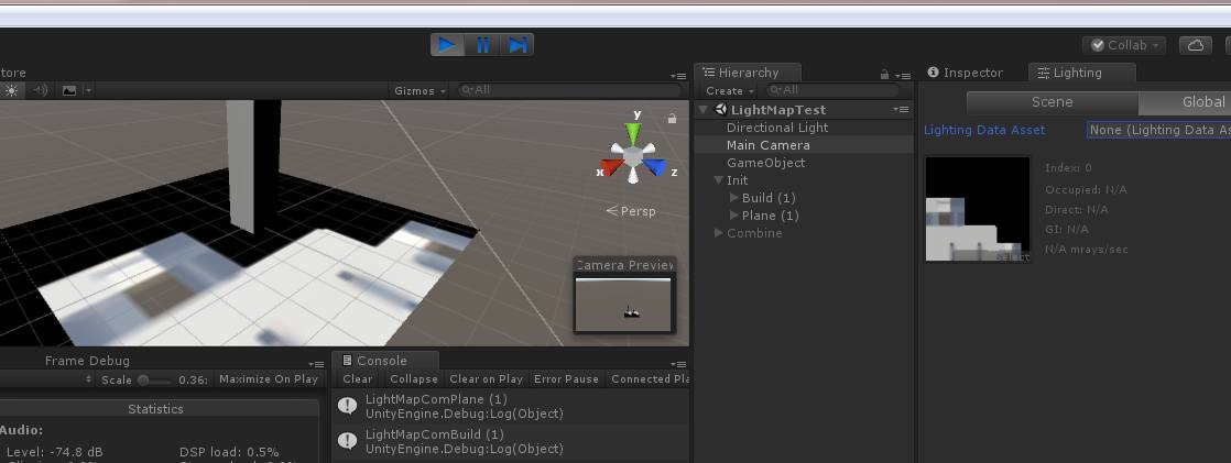 同时,我们发现使用LightingData.Asset时,开启Static Batching与不开启都正确,因此我们认为LightingData.Asset可能记录了与CombinedMesh有关的数据,导致如果仅仅使用gameobject的LightMap参数无法正确读取CombinedMesh的LightMap UV。另外一种可能是Unity的一个Bug。