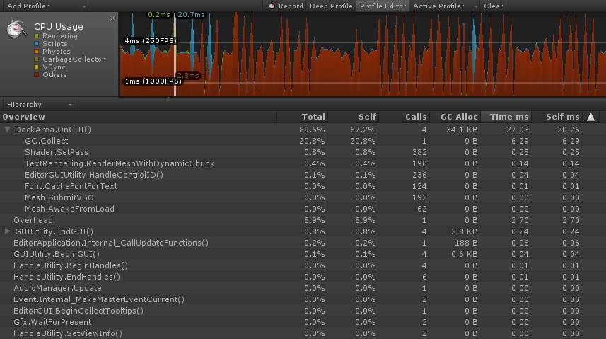 但默认情况下,Editor本身的开销在Profiler里是看不到的,除非题主点击一下“Profile Editor”。 点击之后,就可以看到Editor本身函数的耗时和GC的触发了。例如下图: