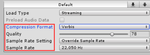 可以看到,在Unity 5.x中,不同平台的音频不再与特定的文件格式关联,而是与文件编码关联。文件格式不等同于音频编码,虽然同是Wav格式的文件,但其有不同的编码方法(PCM,ADPCM,Vorbis,Wav也可以用mp3编码),编码方法会影响到Apk的大小。