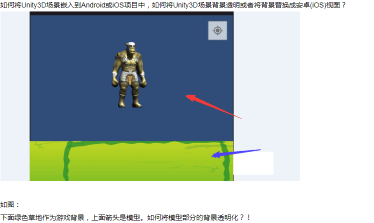 Q:如下图,蓝色部分为Unity视图,绿色为Android图片,我现在需要把Unity蓝色区域透视或者去除,iOS上已经透视成功,但Android一直失败,Unity版本为5.5.2,大家有什么建议呢?