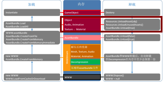Q:对于运行时动态加载的普通模型比如怪物,我们目前的打包策略是把它单独打一个AssetBundle包,通过AssetBundle加载并实例化的消耗。如下图所示,对于WWW、AssetBundle、GameObject,卸载方法分别为WWW.Dispose、assetBundle.Unload、Destroy/DestoyImmediat。但对于通过AssetBundle加载出来的Assets资源, 这块的资源用什么策略清理合适?