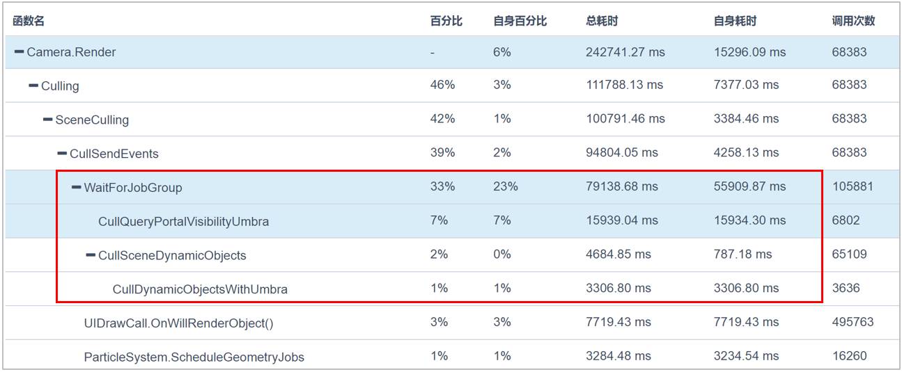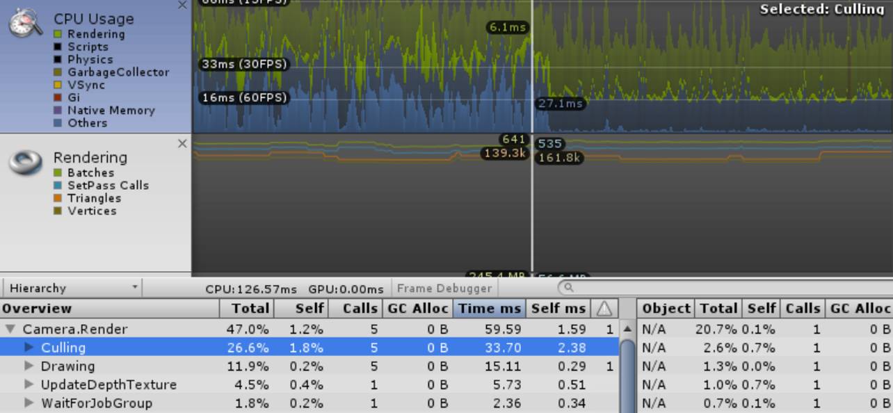 下图为我们优化过的一个案例,项目中开启了Occlusion Culling功能,由于场景过于复杂且Cell也烘焙较细,所以可以看到其Culling中的WaitingForJob耗时达到了33%。