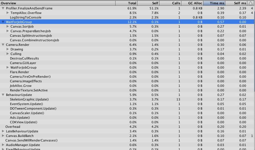(2)WaitForJobGroup这个是主线程在等待子线程完成的耗时开销,如果该项较高,那么说明该帧中某子线程的开销很大。就目前我们优化过的项目而言,绝大部分均为UGUI在子线程的开销所致。更多的参考资料建议研发团队参考UWA问答之前的记录: