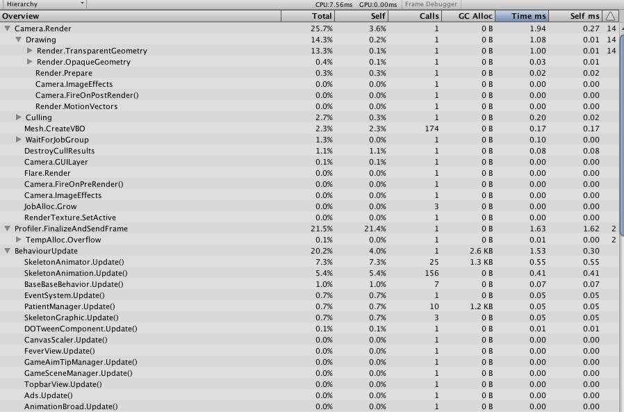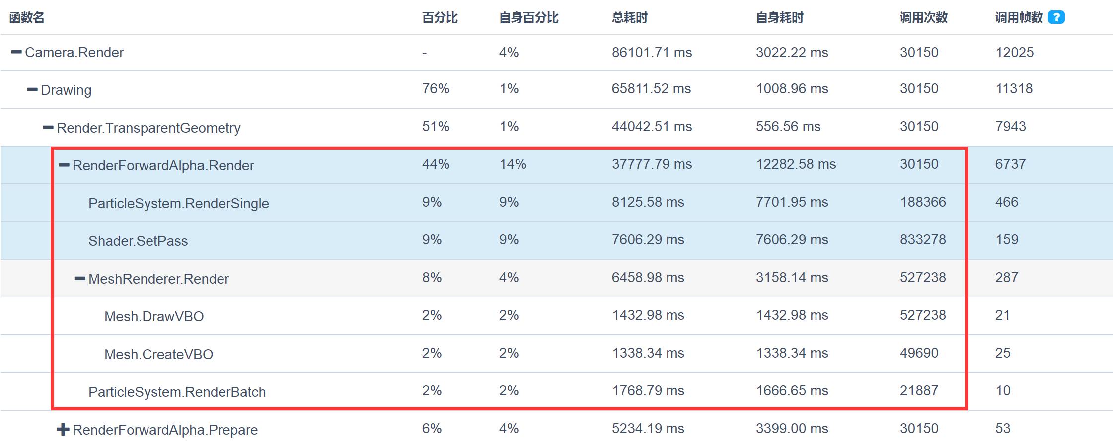 虽然我们在报告中目前建议总体Draw Call的整体范围控制在[0,200]区间内,但其并不是一个保险的数值,特别是2D游戏,其渲染的耗时很大一部分可能是Sprite和UI的渲染开销,就这种情况,还没有一个放之四海而皆准的建议。因此,只能建议题主来具体查看渲染模块中的具体开销(类似于下图),并就具体瓶颈进行具体优化。