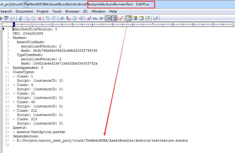 将资源A(material)打包到testmaterial.bundle,然后将纹理B打包到testtexture.bundle,再使用一个Sprite C引用纹理B后,将Spirite生成一个Prefab并将其打包到testprefab.bundle。最后导出成的3个Assetbundle之间的依赖关系为:A(testmaterial.bundle)依赖 B(testtexture.bundle),C(testprefab.bundle)依赖B(testtexture.bundle) ,从最后的生成的manifest也可以看出来依赖关系跟预期的一致。