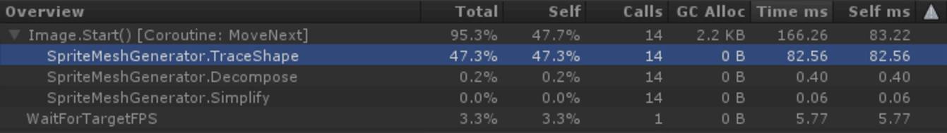 Q:请问UGUI Image 在切换Sprite(网络图片) 的时候有卡顿,从Profiler中看到具体卡在SpriteMeshGenerator.TraceShape 这个方法上,如下图所示,有没有什么优化的方法呢?