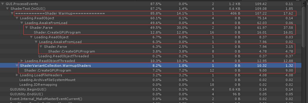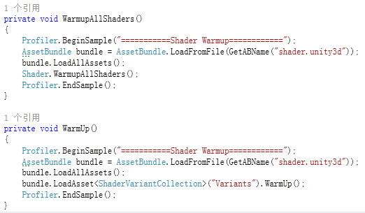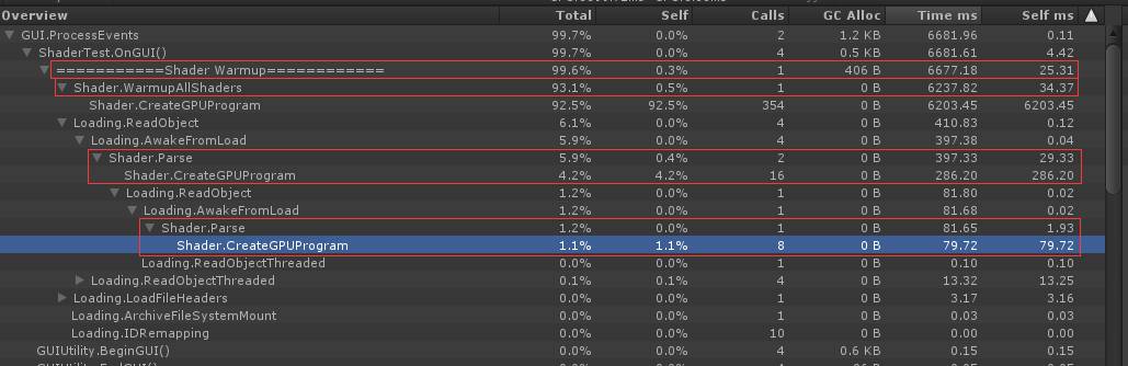 Unity5.4.1中,我将需要的Shader打到一个AssetBundle包中(包含一个关联了所有Shader的Shader Variants),分别用Shader.WarmupAllShaders和ShaderVariantCollection.WarmUp两种方式进行预加载,后者耗时更少。