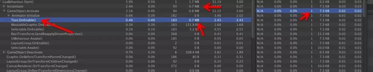 A:图中的Instantiate实例化操作应该是实例化一个较为复杂的UI界面,其中还通过Active/Deactive激活和关闭部分UI界面。Instantiate实例化会触发Object上挂载脚本的构造函数(..ctor操作)和Awake操作,而这些函数中的堆内存分配均被计算在Instantiate实例化操作中;同时,UI界面的Active和Deactive也会造成UI代码底层的一些相关OnEnable和OnDisable操作,同样会造成一定的堆内存分配。而上图中之所以堆内存分配量较高,是因为Instantiate和Active的调用次数较多,分别为93次和183次。因此,图中堆内存分配过高并不是实例化一个Prefab所致,是同一帧中实例化和Active了大量UI Prefab所致。建议研发团队对项目运行时的UI实例化频率进行进一步检测。