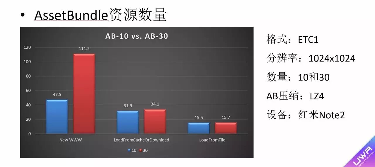 2. 即便是LZ4的AB,其加载方式不同,加载效率也可能完全不一致。以下是我们在UWA DAY 2017的分享,我们在两个不同的AB(LZ4格式)中都加载同一个资源,唯一不同的是一个AB包含10个Asset,而另一个AB包含30个资源,以下是三种不同方式从加载AB到AB.Load的耗时对比。可以看出,New WWW加载出现了明显的时间差异。因此,在Unity5.3之后,尽可能建议通过LoadFromFile(Async)来对AB进行加载。