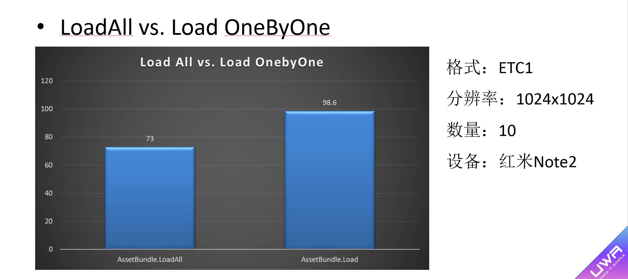 3. 对于AB的打包,尽可能把逻辑上同时出现(一个Prefab中非Share的Asset)、小而细碎的资源(Shader、Material、粒子系统等)尽可能打包在一起,并通过LoadAll来进行加载,因为这样会带来更好的加载效率。下图为LoadAll和Load One By One的性能对比。在我们做过的实验中,LoadAll确实会带来更好的性能开销。