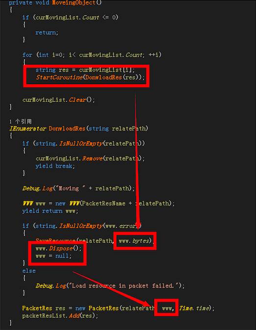 (1)代码中通过For循环开启一个Coroutine,通过WWW加载AB,然后保存www.bytes信息,这可能是准备后续通过LoadFromMemory来加载。这里如果www.bytes量持续增加,且没有很好地管理的话,那么很可能会造成大量内存占用,特别是堆内存;