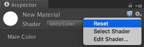 A:在切换Material所使用的Shader时,其上的纹理引用确实是不会自动清除的(除非被覆盖)。因此,我们的建议是,在编辑Material时,如果要切换Shader,那么在切换好之后,进行一次Reset的操作(如下图所示,该操作会重置所有使用中的属性,同时去掉未使用的属性),然后再开始编辑其属性。
