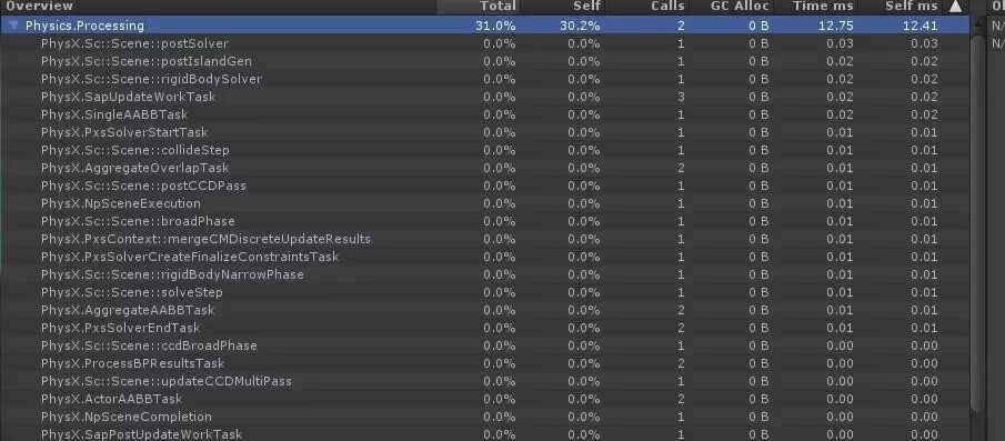 第二情况造成较大CPU开销的情况不多,不过如果你的项目是多角色游戏(比如MMO、MOBA、ARPG割草游戏等),那么你需要注意了。在我们优化过的一些项目中,通过Rigidbody API来移动GameObject位置(设置velocity、改变center等)确实会存在较高的性能开销。如果你的项目也有类似的做法,那么要时刻关注物理模块的开销了。