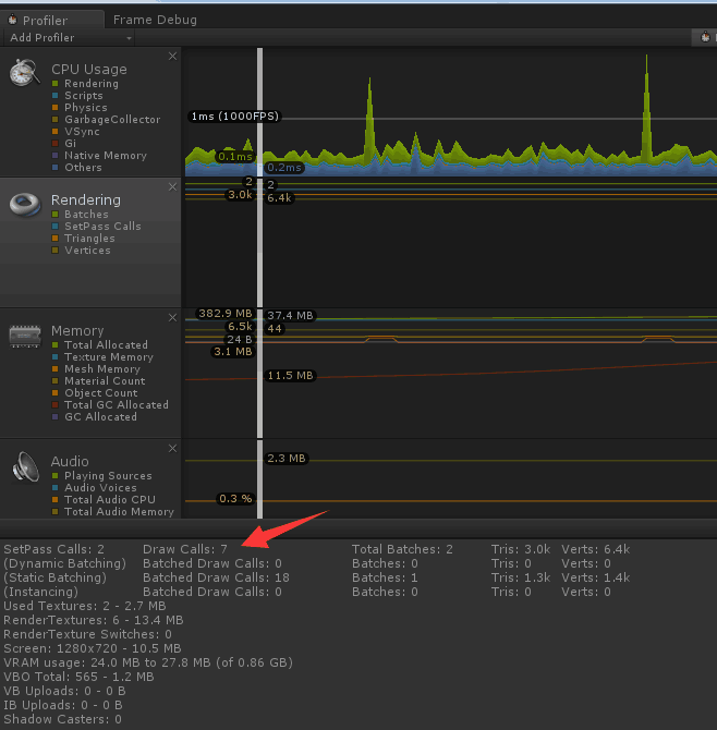 按道理来说这是的DrawCall应该是2,但是查看Profiler的时候却显示Draw Call为7,这是怎么回事呢?