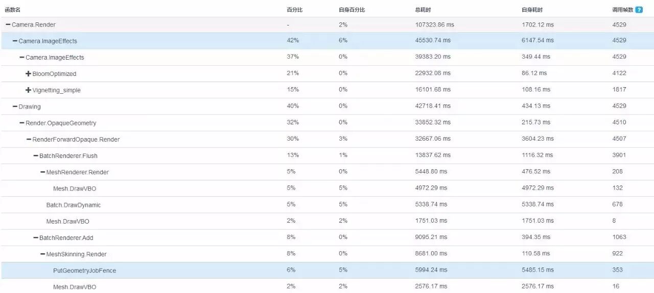 A:研发团队可以在UWA报告中查看“Camera.Render”的具体性能堆栈(高CPU占用函数列表中),通过该堆栈即可看到该项目在渲染模块中详细的性能瓶颈。