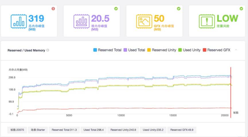 A:对于绝大多数平台而言,Reserved Total内存 = Reserved Unity内存 + GFX内存 + FMOD内存 + Mono内存。Reserved Unity为Unity引擎自身各个模块内部的内存分配,包括各个Manager的内存占用、序列化信息的内存占用、WebStream的内存占用和部分资源的内存占用等等,所以纹理资源仅是Unity引擎使用内存的一部分。除纹理资源外,研发团队还需要注意Mesh资源、AnimationClip、RenderTexture、Font资源等等,同时还需要关注AssetBundle文件在内存中的驻留情况(可在UWA报告中的“资源管理->具体AB使用情况”页面中查看),因为它可能会导致SerializedFile和Webstream内存(Unity5.3版本后不再有WebStream)的内存占用过高。