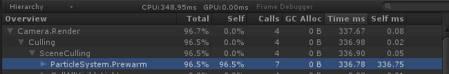 A:ParticleSystem.Prewarm的出现表示当前加载、激活或者首次渲染的粒子系统开启了"Prewarm"选项,而开启该选项的粒子系统在加载后会立即执行一次完整的模拟。以“火焰”为例,Prewarm开启时,加载后第一帧即能看到“大火”,而不是从“火苗”开始逐渐变大。但Prewarm的操作通常都有一定的耗时,建议在可以不用的情况下,将其关闭。