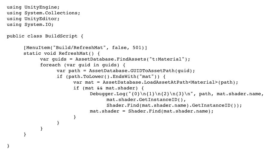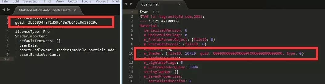 上图可以直接看到这两个资源是同时出现,且均为冗余资源。对此,建议开发团队直接生成一个新的Material来代替Default-Material。2. 其他Shader关联不上的原因可能是:新下载Shader的GUID与项目中原始资源关联的GUID不一致,如下图所示。对此,大家需要自行对Meta文件中的相关GUID进行修改,将原始GUID替换为新下载Shader的GUID。最下方为一个批量处理该类问题的脚本代码,感谢QQ讨论群中网友wupei的提供!