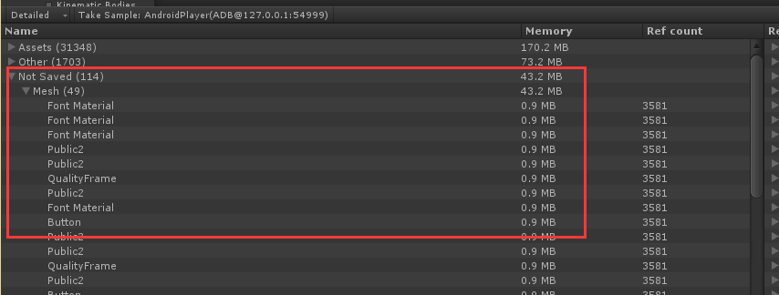 A:Profiler中的Not Saved指的是项目中通过代码生成的各种资源记录。如上图所示,其Mesh均为NGUI插件通过脚本生成的UI界面Mesh资源。