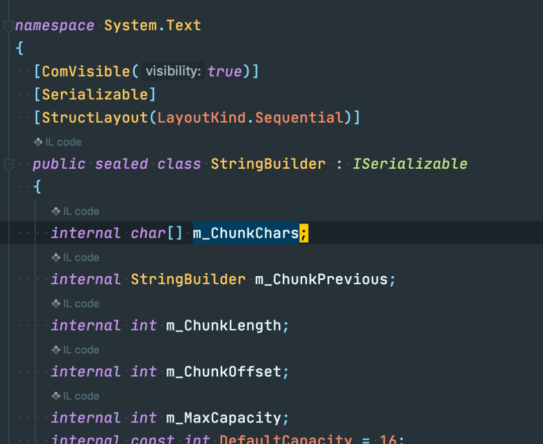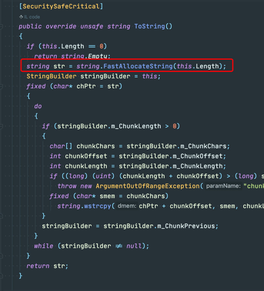 反正你是通过反射来获取到内部的ChunkChars来直接操作。干脆在外部重写一个ToString方法,ToString内部的这个str你可以准备一个全局的,尺寸设置稍微大点。这样是不是可以达到你的目标。(我没试过,提供一种思路参考。)