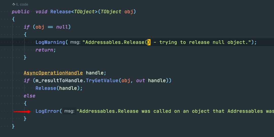调用LoadAssetAsync时会调用TrackHandle,给Load的Completed事件添加一个OnHandleCompleted处理,这个处理内会将Load方法返回的Handle给保存到m_resultToHandle,在Release的时候去找这个Handle,并调用这个Handle.Release方法来做实际的Release操作。