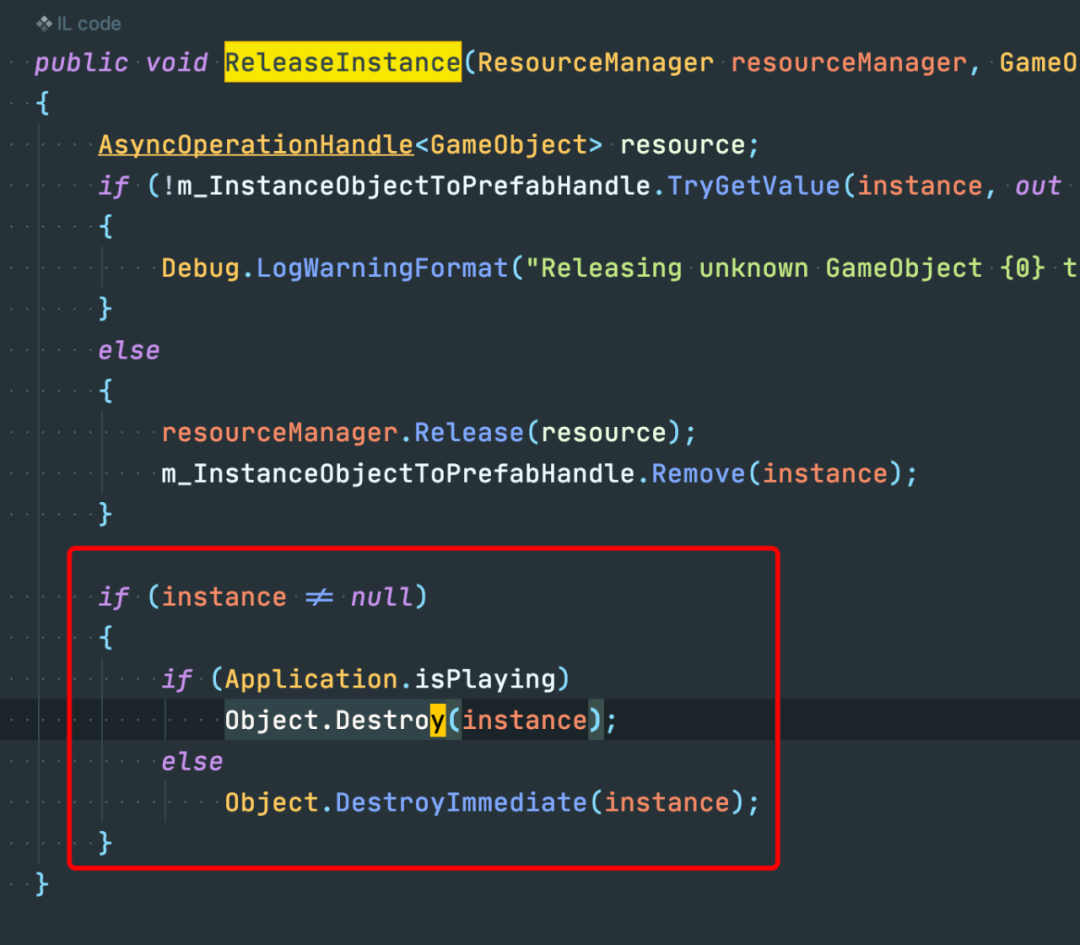 2. 使用Addressables.ReleaseInstance,那么系统会去调用AsyncOperationBase.DecrementReferenceCount,当引用计数为0时,调用ResourceManager内部类的InstanceOperation.Destroy方法,最终调用到InstanceProvider.ReleaseInstance,这时你会发现系统其实也是简单的Object.Destroy而已。