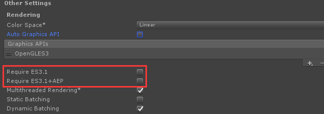 Q1:大概知道Auto Graphics API是判断设备是否支持OpenGL3的,如果不支持尝试OpenGL2,但是线性空间下,只能选OpenGLES3,会多出来Require ES3.1和Require ES3.1+AEP。