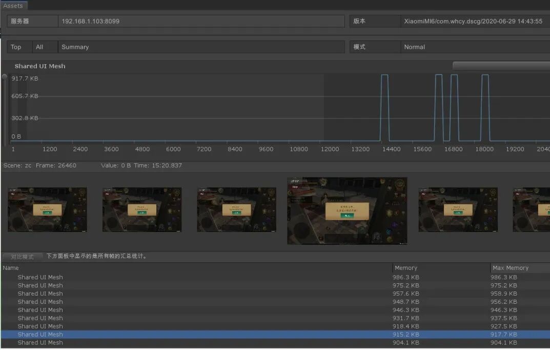 隐藏缓存池中的UI时,Shared UI Mesh内存占用: