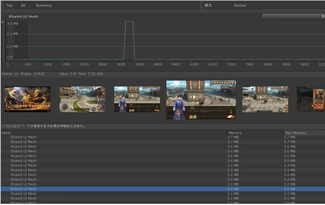 需要注意的是,Canvas组件被禁用的情况下,Profiler里是看不到的,但其下的激活UI元素依然会影响Shared UI Mesh的大小。
