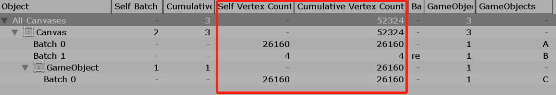 2. 通过Profiler的UI面板,查看各个Canvas下各个Batch产生的顶点数,并检查对应的GameObject即可。